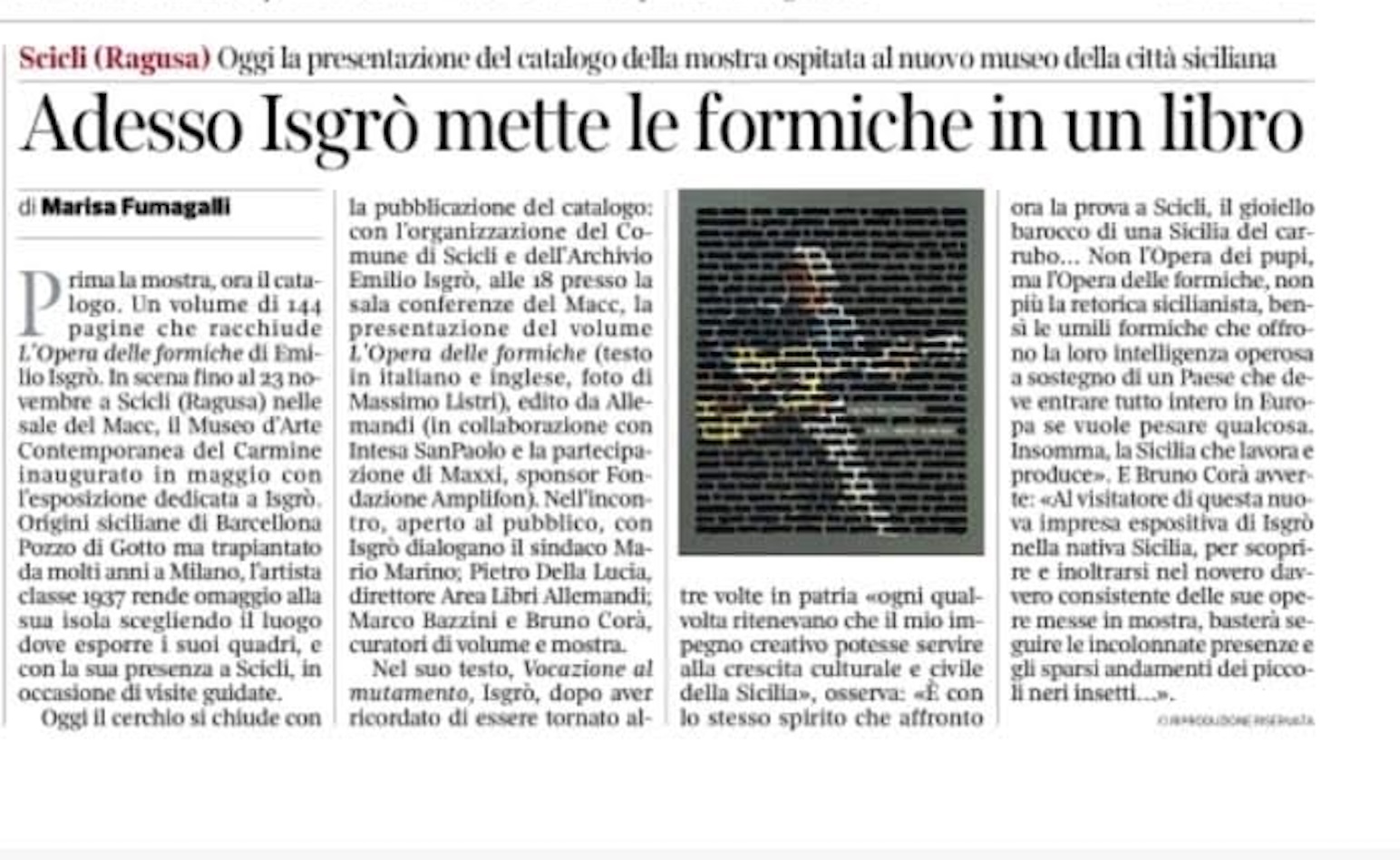 Il Corriere della Sera: A Scicli Isgrò mette le formiche in un libro