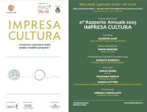 News Federculture presenta il 21esimo rapporto sullo stato della cultura in Italia al Macc di Scicli Dicembre 30, 2025 / Dicembre 30, 2025 da Giuseppe Savà Mercoledì 7 gennaio 2026 alle 17:00 Analisi, modelli, proposte per il turismo culturale in Italia.Sarà presentato mercoledì 7 gennaio 2026 […] Leggi tutto »